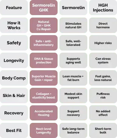 Amplify Muscle Growth & Recovery – Sermorelin drives GH release while GHK-Cu accelerates cellular repair.